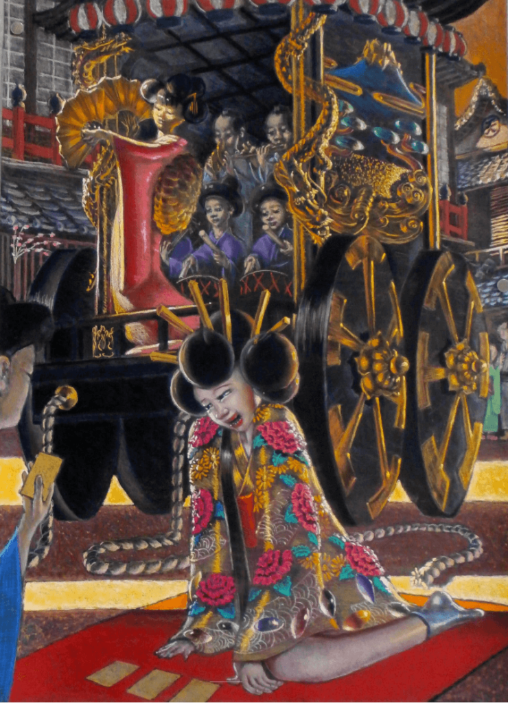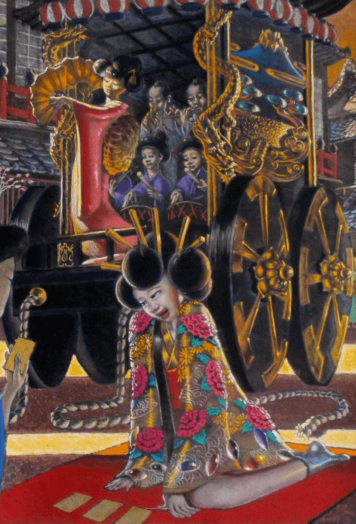 祭りの山車が通りに入ってきた。